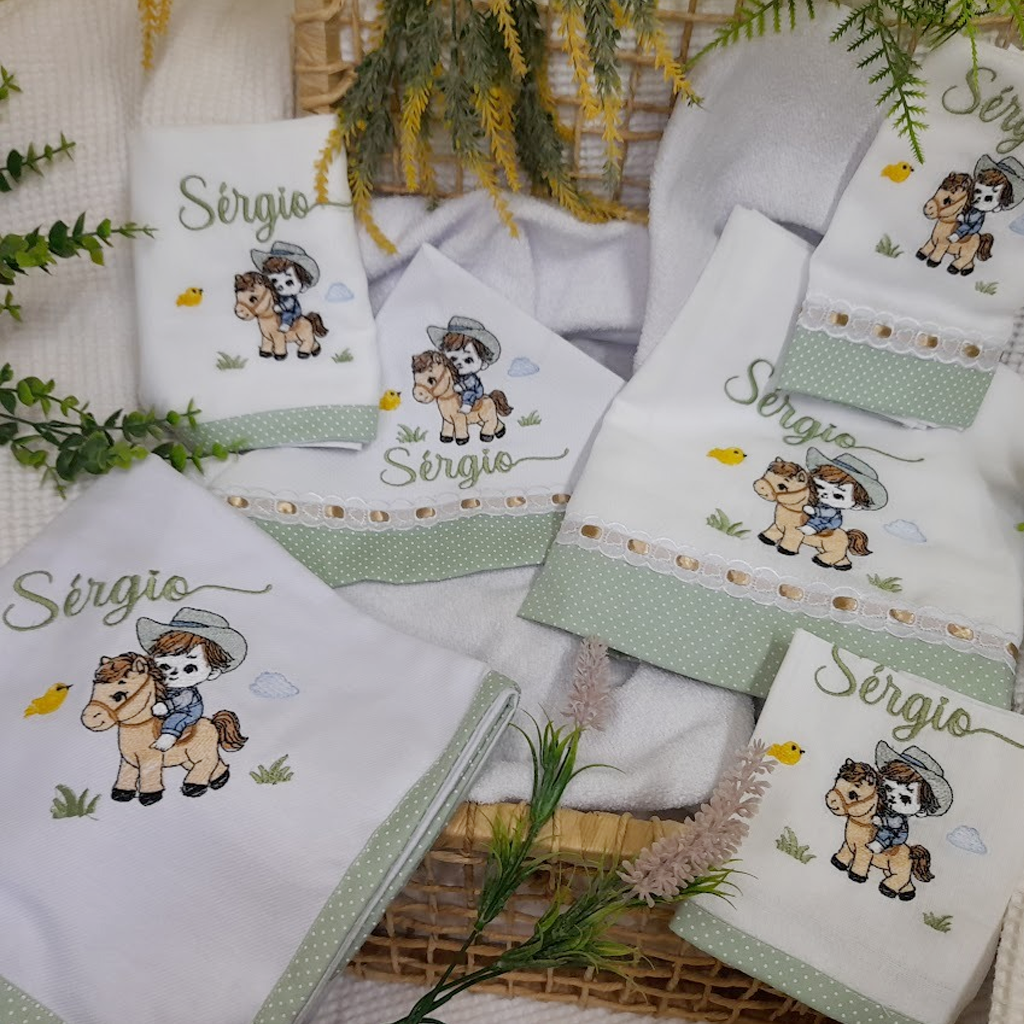 - Acabamento Artesanal: Fraldas e lencinhos de boca com barrado em crochê ou tecido, pensados para serem fáceis de cuidar e passar.